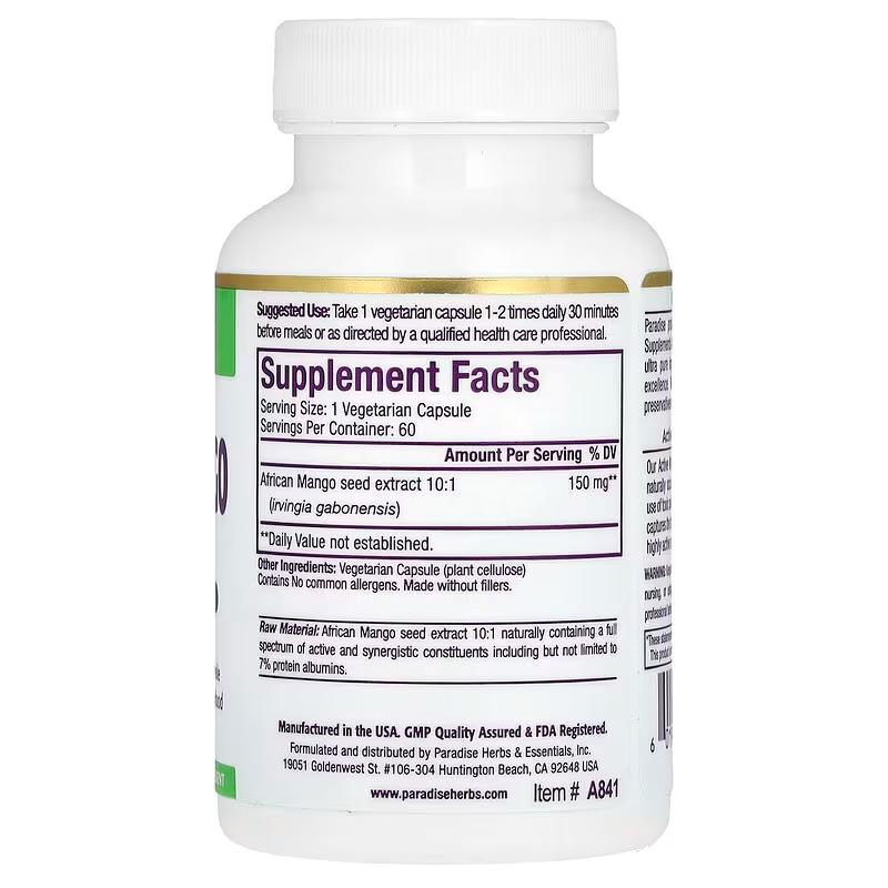Екстракт ірвінгії габонської, African Mango Extract, Paradise Herbs, 150 мг, 60 вегетаріанських капсул