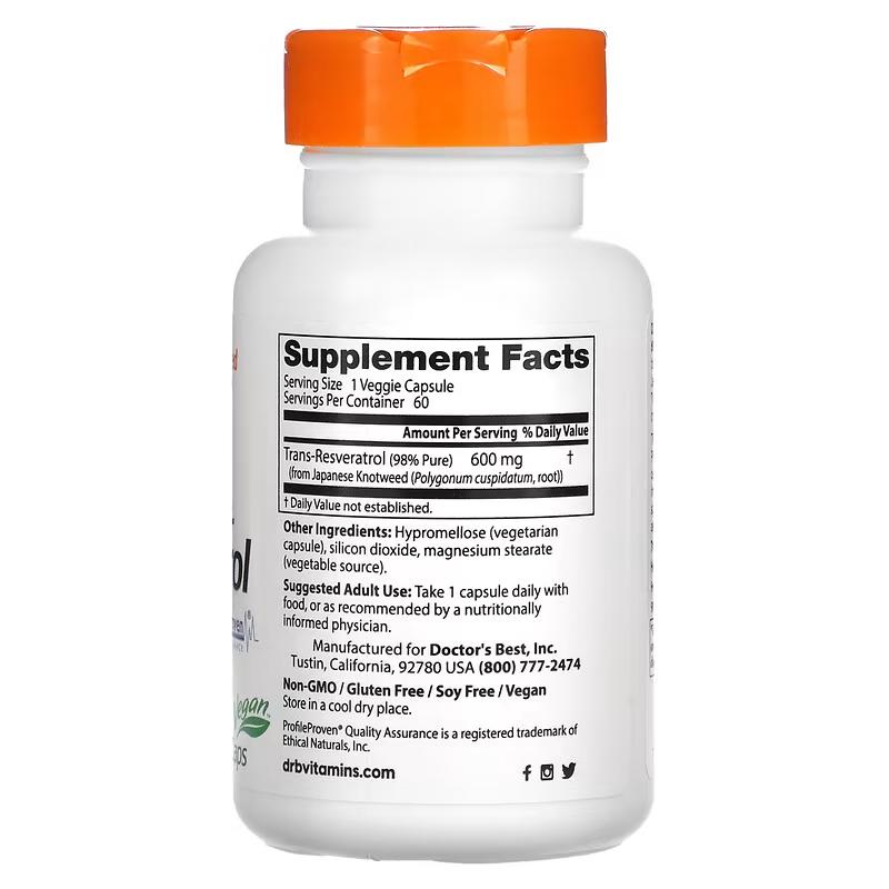 Високоефективний транс-ресвератрол 600, Best High Potency Trans Resveratrol 600, Doctor's Best, 600 мг, 60 веганських капсул