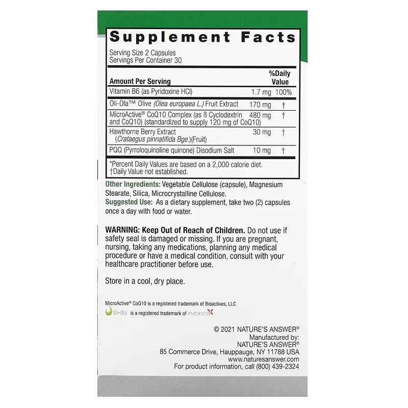 CardiMAX від компанії Nature's Answer — це унікальна формула, розроблена із першокласної сировини, зареєстрованої під торговою маркою. Скориставшись перевагами Oli-Ola(tm), MicroActive(r) CoQ10, піридоксину гідрохлориду, PQQ (піролохінолінхінону) та глоду, всі ці компоненти спільно забезпечують максимальну підтримку для здоров'я серця.