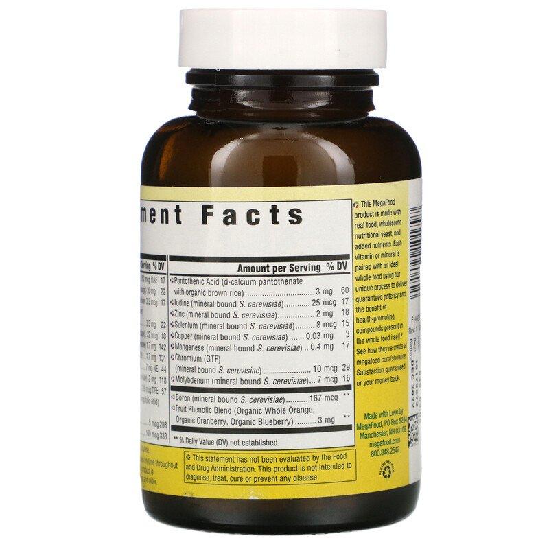 | ** Відсоток від добової норми не визначено. Цей продукт MegaFood вироблено з натуральних продуктів, чистих харчових дріжджів і доданих поживних речовин. Кожен вітамін і мінерал поєднується з ідеальними цільнохарчовими інгредієнтами із застосуванням нашого унікального процесу, що забезпечує гарантовану ефективність і корисні властивості сполук, які підтримують здоров'я, і які присутні в самій їжі. |