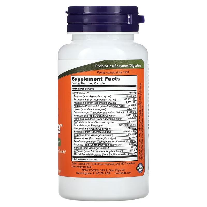 Digest Ultimate™ від компанії NOW Foods ефективно розкладає білки, вуглеводи, жири, а також складні компоненти, такі як лактоза з молочних продуктів, клітковина з овочів і бобових. Цей продукт придатний для вегетаріанців, що робить його універсальним засобом підтримки повноцінного травлення.
