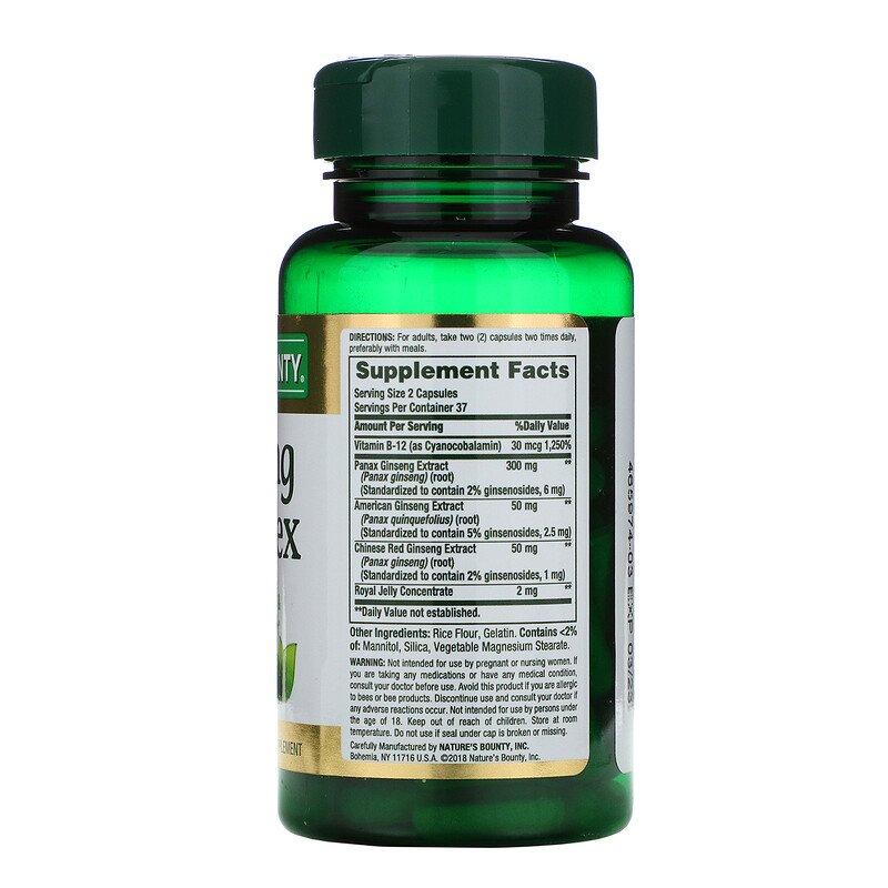 Підтримуючи енергію та імунну функцію організму, комплекс із женьшенем у капсулах Ginseng Complex вироблений із натуральних інградієнтів. В основі Комплексу від Nature's Bounty, що являє собою харчову добавку на рослинній основі, лежить женьшень, який багатий на природні гінзенозиди та флавоноїди. Препарат містить два види женьшеню - китайський червоний і американський, що мають рослинне походження.