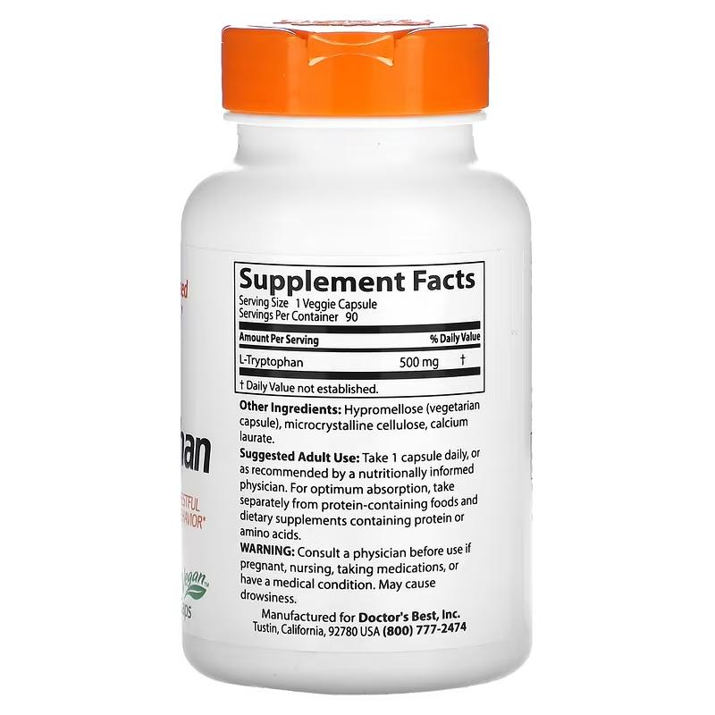 L-триптофан з TryptoPure, L-Tryptophan with TryptoPure, Doctor's Best, 500 мг, 90 рослинних капсул