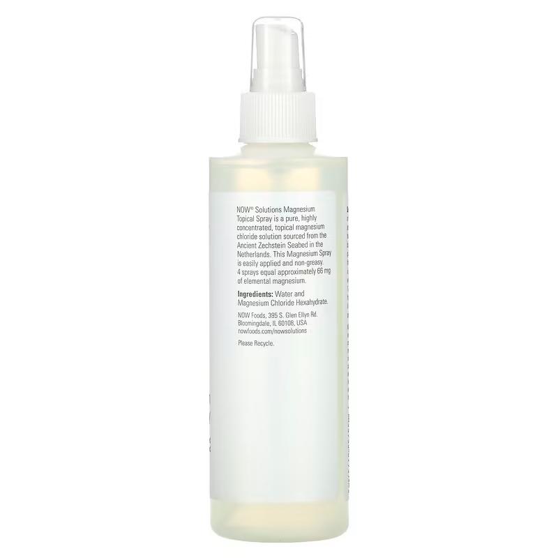 Спрей з магнієм для зовнішнього застосування від NOW® Solutions є чистим і висококонцентрованим розчином хлориду магнію, отриманого з древнього Цехштейнського моря в Нідерландах. Цей спрей легко наноситься та не залишає відчуття жирності. Усього чотири натискання для розпилення містять приблизно 66 мг елементарного магнію.