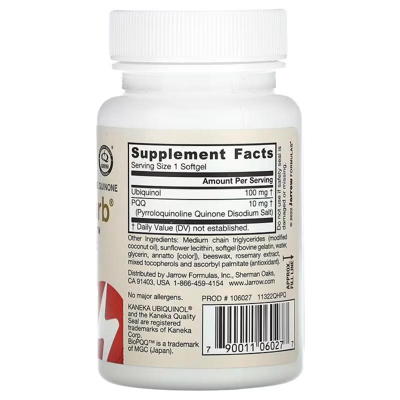 Jarrow Formulas, Ubiquinol, QH-Absorb + PQQ, 30 капсул, представляет собой диетическую добавку, сочетающую в себе три ингредиента: убихинол, форму коэнзима Q10 (CoQ10), PQQ (пирролохинолинхинон) и QH-absorb, систему доставки убихинола.