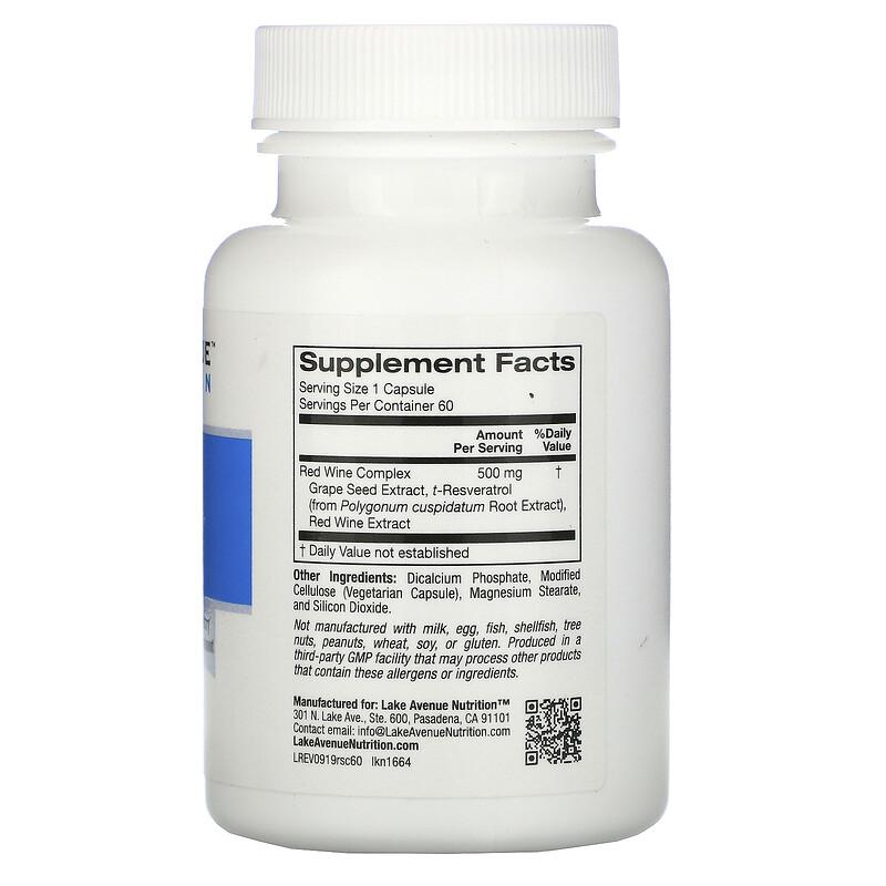 Препарат Ресвератрол (Resveratrol) 500 мг, Lake Avenue Nutrition містить високоякісний екстракт дикоростучого японського горця, органічні ягоди французького червоного винограду і органічного мускатного винограду. Ці рослини використовуються в медицині для довголіття. Не містить тваринних білків.
