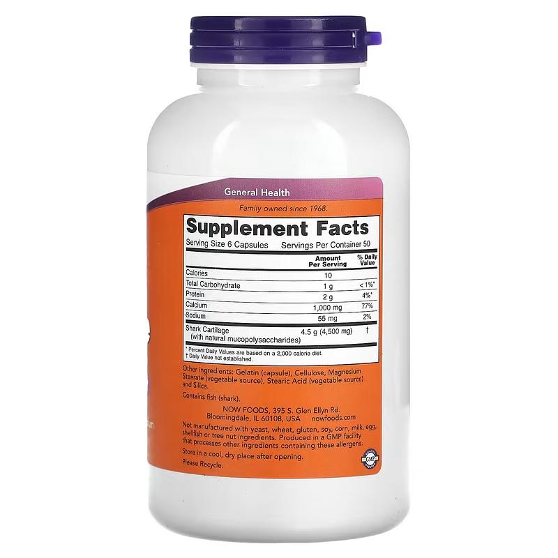 Акулячий хрящ від компанії NOW Foods — це тверда, еластична тканина, яка становить основу скелета акул. Він містить велику кількість кальцію та натуральних мукополісахаридів, відомих як глікозаміноглікани (ГАГ). ГАГ є важливими будівельними блоками хрящової тканини, забезпечуючи мастило і амортизацію суглобів при ударах. Завдяки багатому кальцію складу, акулій хрящ також сприяє зміцненню здоров'я скелета.