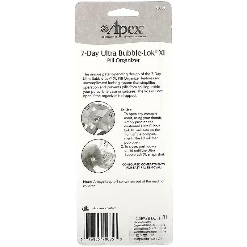 Пропонуємо до вашої уваги органайзер, створений відомою американською корпорацією Apex для своїх лікарських засобів під назвою 7-Day Ultra Bubble-Lok Pill Organizer XL. Ви не пропустите дозу своїх ліків завдяки цьому кишеньковому органайзеру для таблеток. Всі ваші вітаміни залишаться у первозданному вигляді завдяки окремим секціям у кришках.