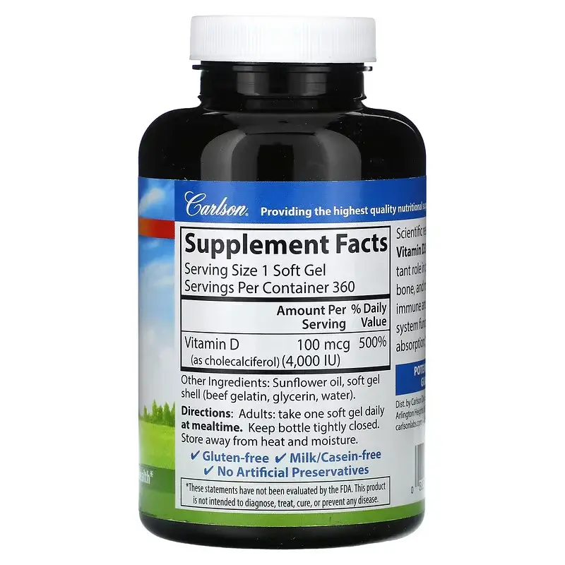Капсули легко ковтати, вони не мають смаку та не містять зайвих домішок. Vitamin D3 від Carlson підходить для щоденного прийому, допомагаючи зберігати силу, енергію та гарне самопочуття навіть у похмурі дні.
