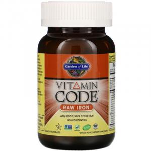 Raw Iron – «сирий» залізовмісний продукт лінії Vitamin Code, відомого бренду, що містить залізо Garden of Life. Комплекс містить залізо підвищеної біодоступності, збагачений фолатом, вітаміном С і В12 для підвищення його всмоктуваності. Для усунення дефіциту заліза можна купити капсули Raw Iron і приймати згідно з призначенням.